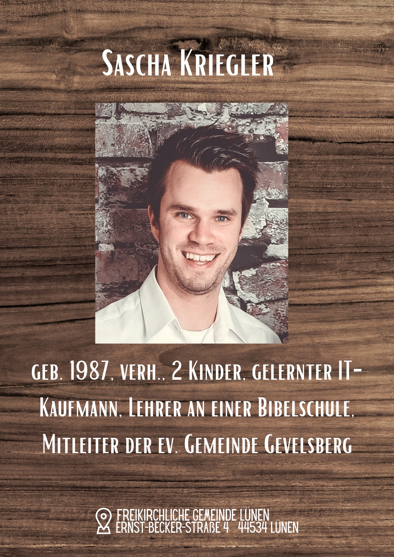 Sascha Kriegler ist geb. 1987, verh., 2 Kinder, gelernter IT-Kaufmann, Lehrer an einer Bibelschule und Mitleiter der ev. Gemeinde Gevelsberg.